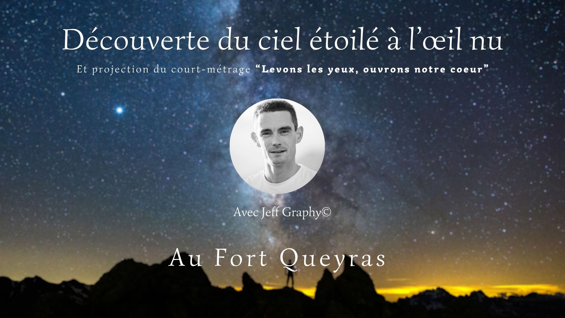 Tu apprendras à repérer les constellations, la voie lactée et tu pourras profiter de la projection du court-métrage “Levons les yeux, ouvrons notre cœur” de Jeff Graphy. Ce sera un moment de partage unique qui se fera dans la cour de Fort Queyras.