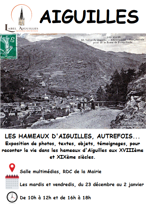 Les bénévoles de l’association Label Aiguilles t’invitent à venir découvrir la vie d’autrefois dans les hameaux d’Aiguilles aux XVIIème et XIXème siècles au travers d’une exposition de photographies, de textes, de témoignages, d’objets…