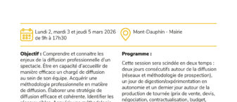 Objectifs : Comprendre et connaitre les enjeux de la diffusion professionnelle d’un spectacle. Être en capacité d’accueillir de manière efficace un chargé de diffusion au sein de son équipe. Acquérir une méthodologie professionnelle en matière de diffusion. Élaborer une stratégie de diffusion efficace et cohérente. Identifier les réseaux cibles. Acquérir une méthodologie efficiente de prospection. Connaître le cadre juridique de la production et de la diffusion du spectacle vivant.