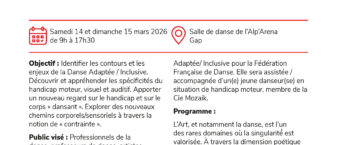 Objectifs : Identifier les contours et les enjeux de la Danse Adaptée / Inclusive. Découvrir et appréhender les spécificités du handicap moteur, visuel et auditif. Apporter un nouveau regard sur le handicap et sur le corps « dansant ». Explorer des nouveaux chemins corporels/sensoriels à travers la notion de « contrainte ».