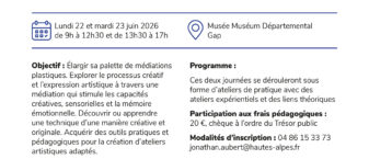 Objectifs : Élargir sa palette de médiations plastiques. Explorer le processus créatif et l’expression artistique à travers une médiation qui stimule les capacités créatives, sensorielles et la mémoire émotionnelle. Découvrir ou apprendre une technique d’une manière créative et originale. Acquérir des outils pratiques et pédagogiques pour la création d’ateliers artistiques adaptés.